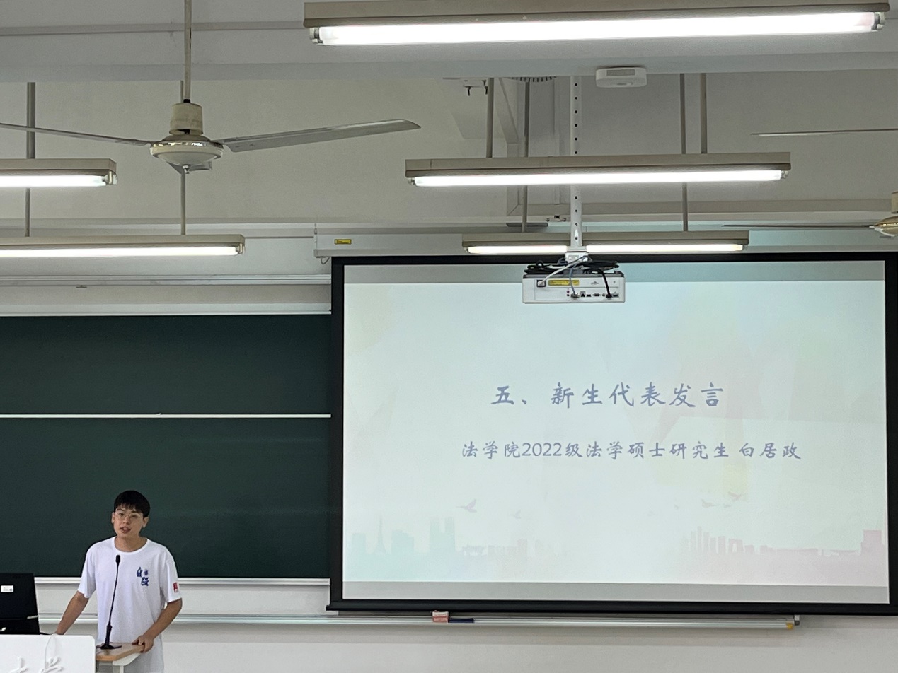 随后,国际法教研室教师李俊峰教授作为教师代表进行发言。他回顾了自身教学科研经历,给同学们提出了几点期望:要不负青春好韶光,以“战吗?战啊”的精神塑造新的、更高层次的自我;要“求真知、爱智慧”,掌握探究式的学习方法和思维方式,从而在更高的起点上实现自己的人生理想,推动国家法治进展。