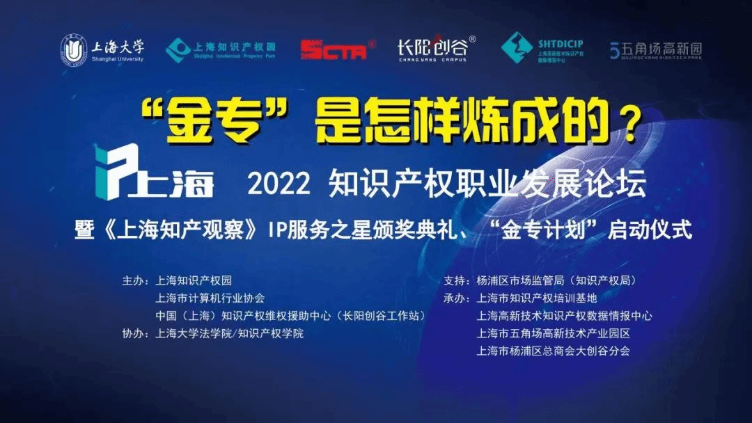 2022年11月5日,IP上海·2022知识产权职业发展论坛在长阳创谷举办。论坛正式开始前举行了“金专计划”启动仪式。来自高校、专利代理机构、律师事务所、企业、政府等各方代表济济一堂,见证了这一人才培养项目的正式启航。