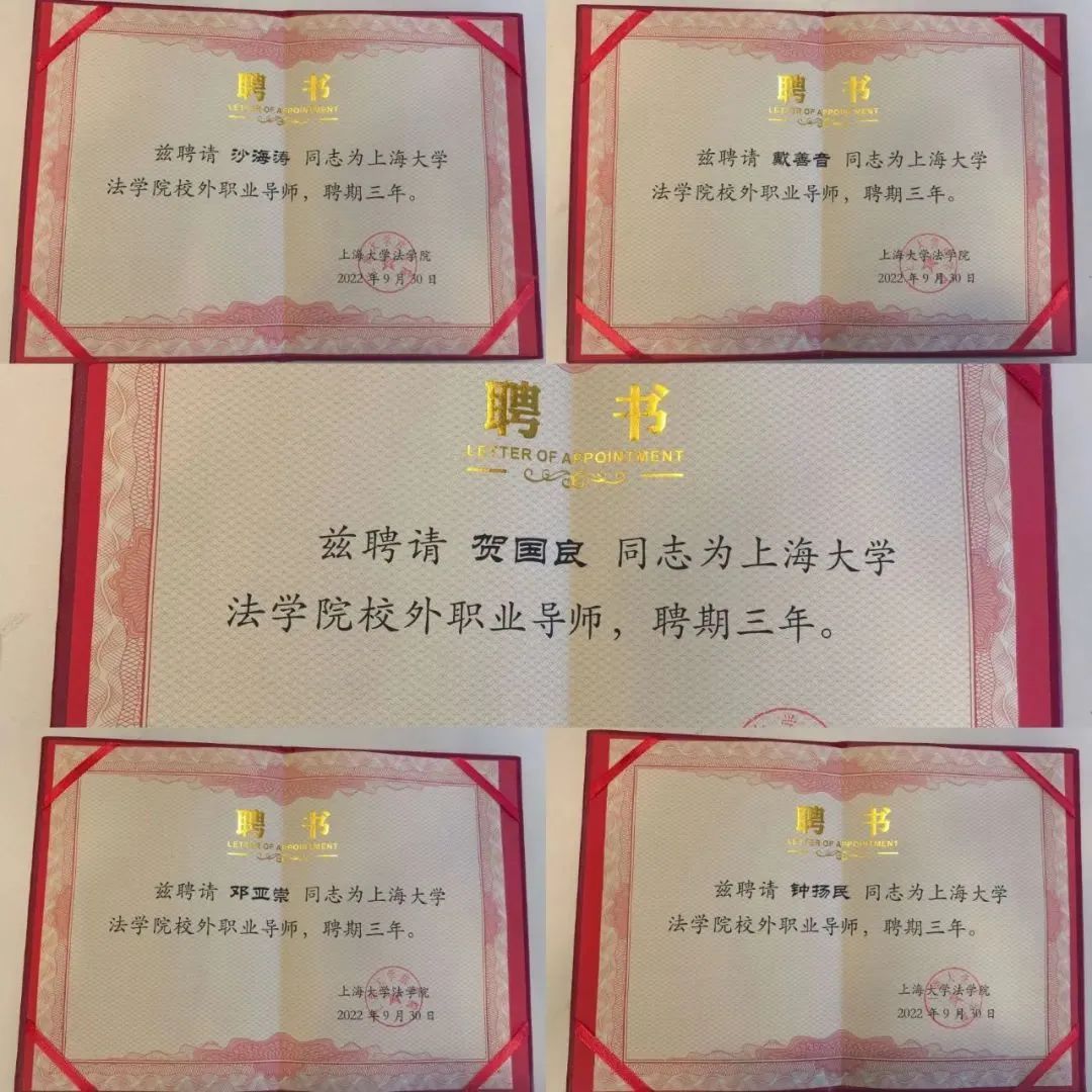 于伟副书记、副院长宣读《英国正版365首页关于聘任贺国良等5位校外职业导师的决定》,聘任贺国良、 沙海涛、邓亚崇、戴善音、钟扬民担任英国正版365首页校外职业导师,聘期三年,承担指导学生的法务实践、创新创业和就业能力提升等工作。