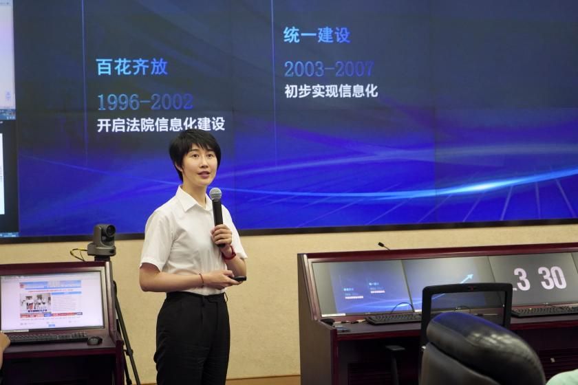 实践团队到达法院以后,法官们首先带领团队成员参观了法院的立案大厅以及实践中的在线立案流程。立案庭法官借助真实案例演示了立案过程,团队成员看到了在实践当中法官对于立案材料的筛选、审核以及各个流程,包括对于重复立案情况的处理。切实感受到了人工智能技术对于立案流程实现智能化、便捷化的推动作用。