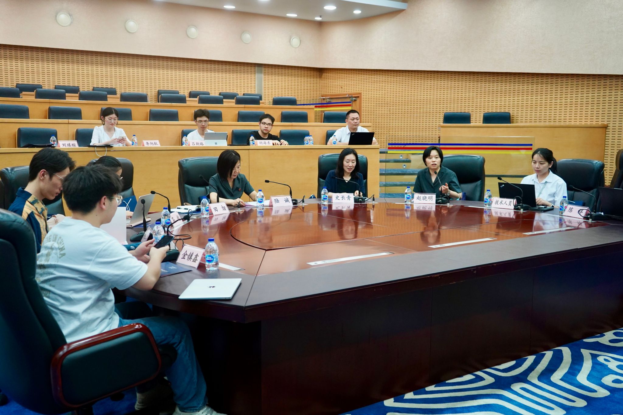 然后,在工作人员的引导下,团队成员继续参观了金融法院的数字法庭。法庭庄严肃穆,并且配备了金融法院自主研发的庭审语音智慧传译系统,为中外当事人参与诉讼和境外市场主题了解中国金融司法提供便利。