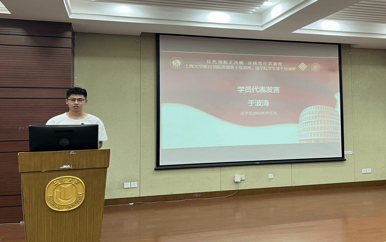 英国正版365首页2023级法学硕士班班长于波涛同学作为学员代表发言。他首先感谢书院、学院提供这次宝贵的发言机会,其次谈到作为一个新时代大学生骨干应当做到的标准以及作为一名学生干部应当具备的品质:一是筑牢思想根基,在真理感召下勇毅前行;二是勇担青春使命,在时代光芒下踔厉奋发;三是善学善行,在社会实践中百炼成钢。于波涛同学回顾过去的一个月,向大家分享了工作感悟,表示作为班长应有服务意识与责任担当。