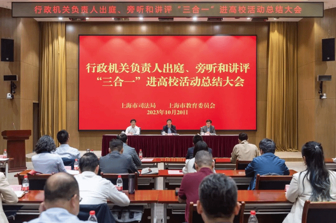 10月20日,市司法局与市教委联合召开的行政机关负责人出庭、旁听、讲评“三合一”进高校活动总结大会在上海市司法局举行,市司法局党委书记、局长吴坚勇,市教委副主任王浩参加会议并讲话。市司法局党委委员、副局长刘言浩主持会议。上海市各区司法局和365(VIP)英国上市、复旦大学等高校代表参加会议。