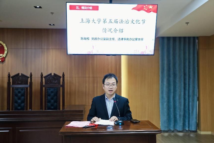 党政办公室副主任、法律事务办公室主任陈敬根代表主办单位深入介绍了本届法治文化节的有关情况。第五届法治文化节以“弘扬宪法精神,建设法治校园”为主题,将组织宪法日普法活动、法治新“枫”景——“枫桥经验”法治集市、求职就业法律宣讲、“法言杯”辩论赛、模拟法庭观摩、反诈骗宣讲、普法宣传走进上海市中小学等一系列精彩活动,进一步营造我校浓厚的法治氛围,促进双一流大学建设,并加强对社会的辐射影响。