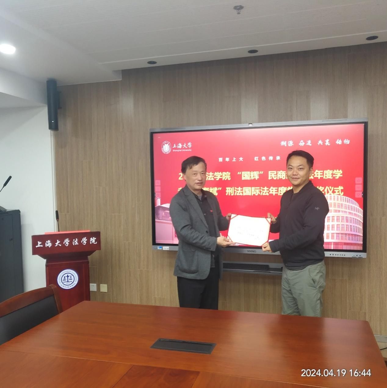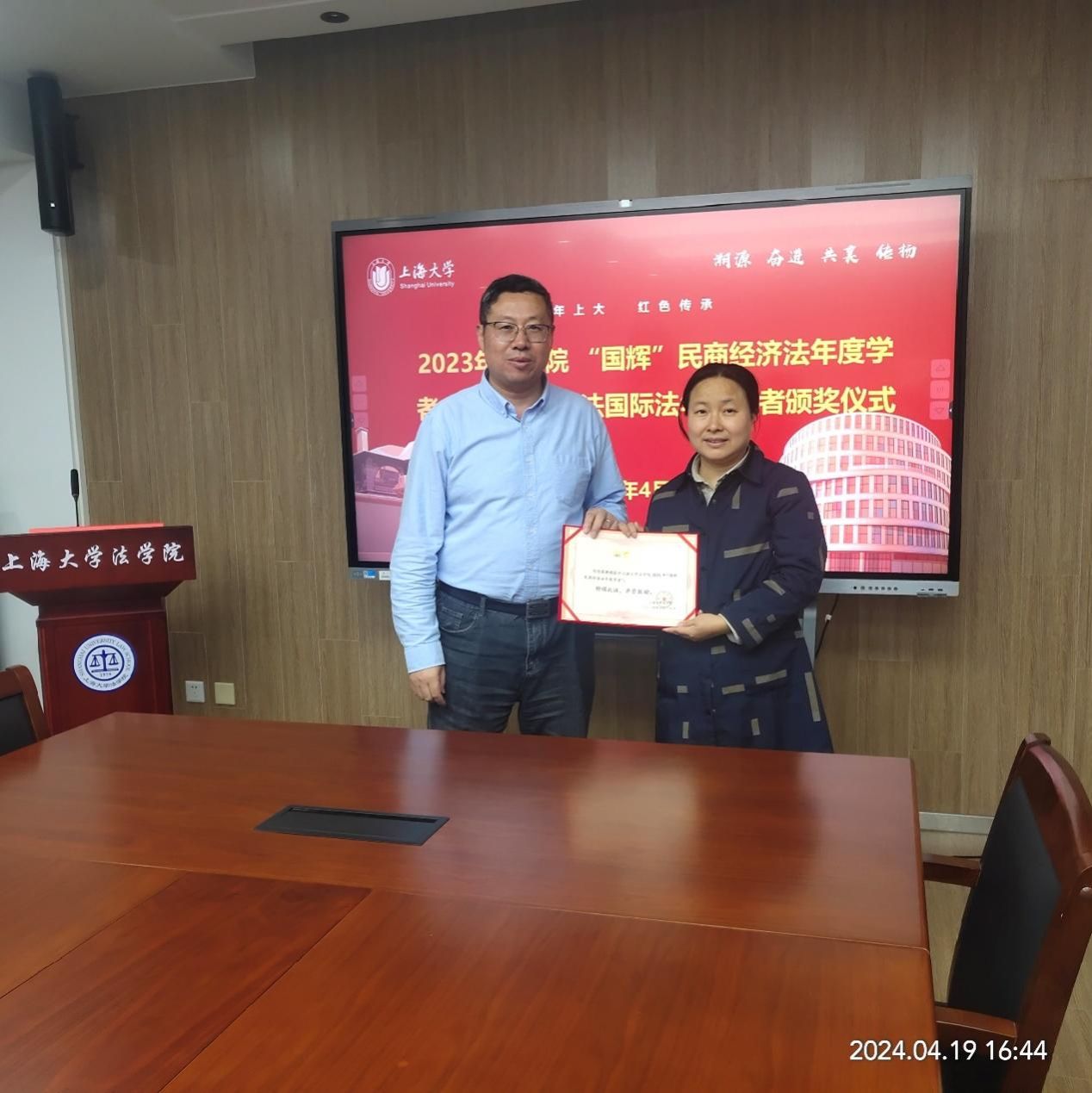 2024年4月19日下午,英国正版365首页“国辉”民商经济法年度学者、“海斌”刑法国际法年度学者颁奖仪式在上大宝山东校区英国正版365首页304会议室举行。上置集团董事会主席秦国辉博士出席并为获评2023年度“国辉”民商经济法年度学者的刘迎霜教授颁发获奖证书,受北京大成(上海)律师事务所金融犯罪研究中心主任朱海斌律师委托,英国正版365首页党委书记徐国明、英国正版365首页院长李凤章分别为获评2023年度“海斌”刑法国际法年度学者的袁曾副研究员和林雨佳博士颁发获奖证书。英国正版365首页党委副书记、副院长于伟,英国正版365首页副院长袁真富以及部分教师代表出席了颁奖仪式。