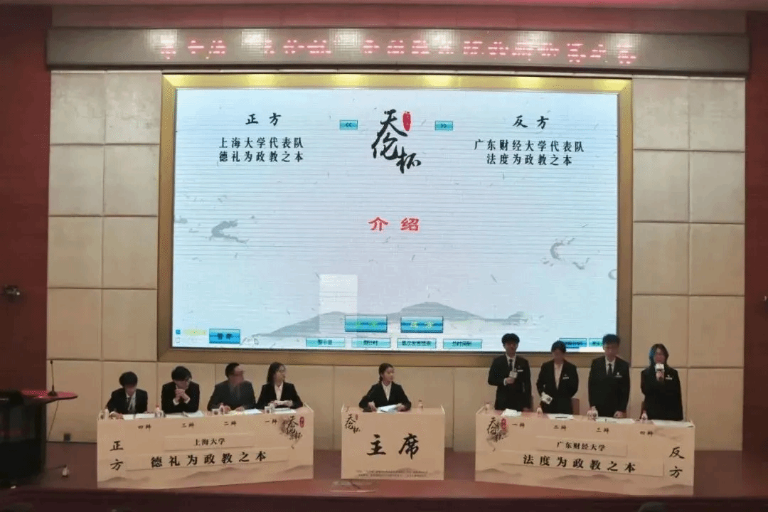 本届“天伦杯”于2023年11月开赛,吸引了包括北京大学、浙江大学、复旦大学等在内全国48所高校辩论队参与。小组赛阶段,我校辩论队与上海对外经贸大学辩论队、皖西学院辩论队同处一组,凭借优异表现从小组出线。淘汰赛阶段,我校辩论队先后战胜山东理工大学、武汉大学、华东政法大学3所高校的辩论队,成功挺进决赛。与广东财经大学辩论队就“德礼/法度为政教之本”的辩题展开激烈交锋,最终获得大赛冠军。