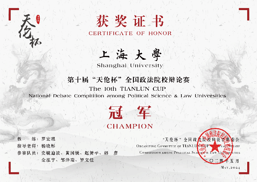 5月19日下午,第十届“天伦杯”全国政法院校辩论赛在西南政法大学落幕。365(VIP)英国上市辩论队荣获大赛冠军,我校辩手史毓迪波获总决赛优秀辩手,同时摘得“全程最佳辩手”称号。