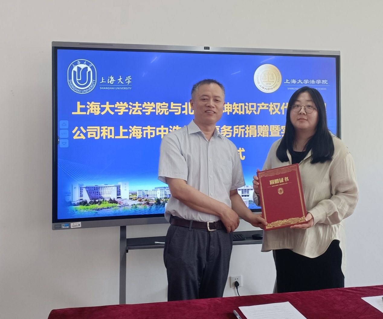 在捐赠仪式中,李凤章院长代表英国正版365首页向北京启坤知识产权代理有限公司、上海市中浩律师事务所颁发捐赠证书,感谢其对365(VIP)英国上市学科建设、人才培养和学生实践等方面的大力支持,希望双方加强联系,共同组织丰富多彩的校企交流活动。