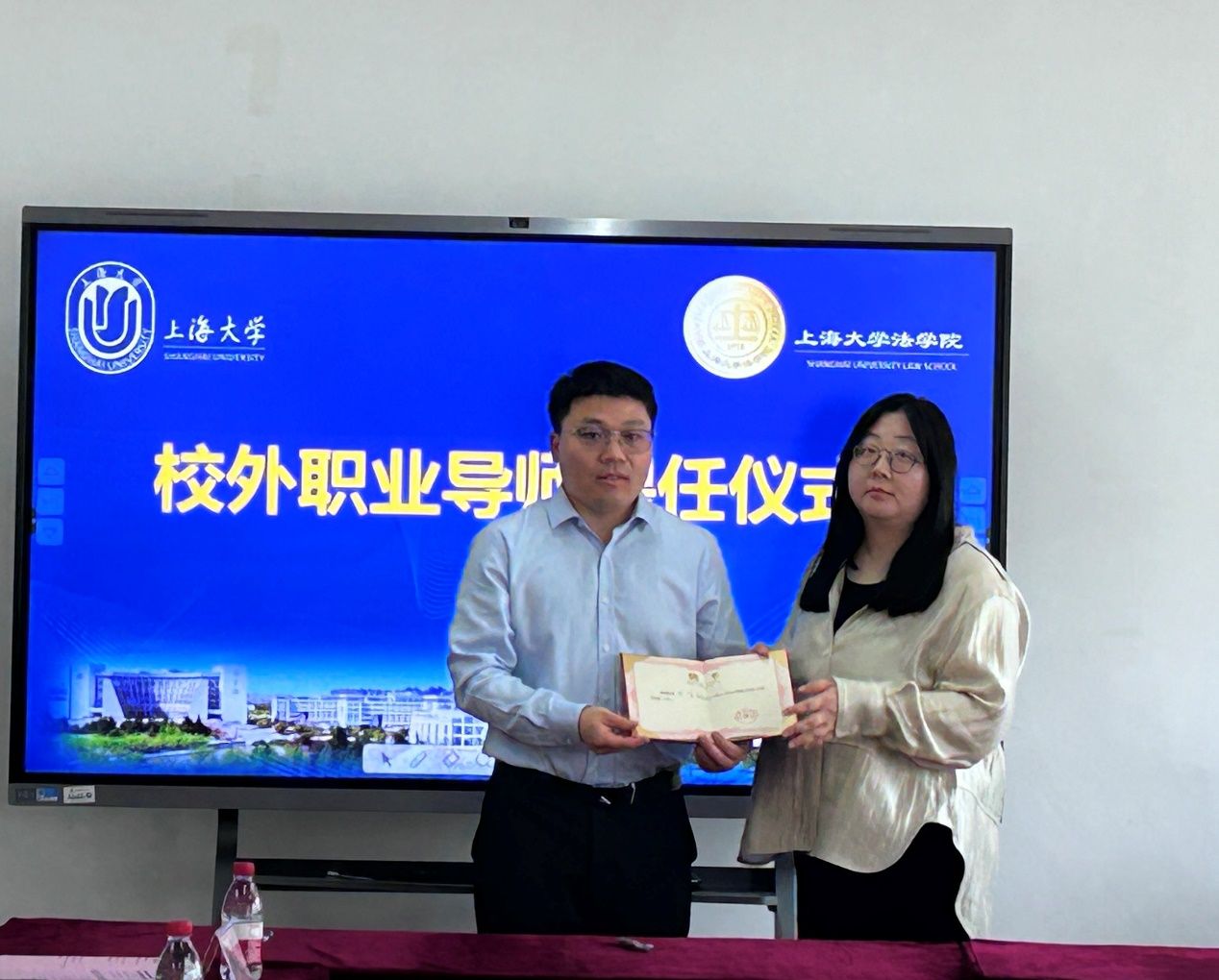 在英国正版365首页校外职业导师聘任仪式上,于伟副书记代表英国正版365首页向龚清华、王飞两位校外职业导师颁发聘书。于伟老师首先对二位的到来表示热烈欢迎,介绍了学校及学院的办学历程,在人才培养、学科建设等方面取得的成就以及未来发展的目标,并希望未来加强与律所、企业的双向合作、促进共同发展。