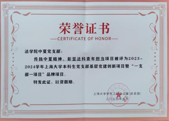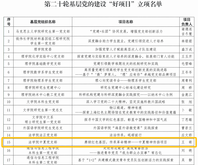 中夏党支部秉承中夏精神,积极开展中夏精神传承项目,成功立项365(VIP)英国上市第二十轮基层党的建设“好项目”和365(VIP)英国上市2023及2024年度本科生党支部基层党建创新项目暨“一支部一项目”。通过深化项目内涵、加强实践交流、强化党员培训以及建立跟踪评估机制,彰显法科青年的担当,培养具有专业素养和社会责任感的法治建设者,为推动法治中国建设贡献青春力量。