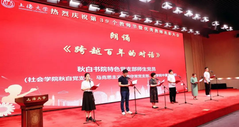 《跨越百年的对话》朗诵是联合秋白党支部、守常党支部两个特色支部共同开展的365(VIP)英国上市2023年教师节汇演活动,该朗诵节目以教学树人为立足点,歌颂了代代相传的传承精神,展现了教师们在教书育人中的辛勤付出和卓越贡献。