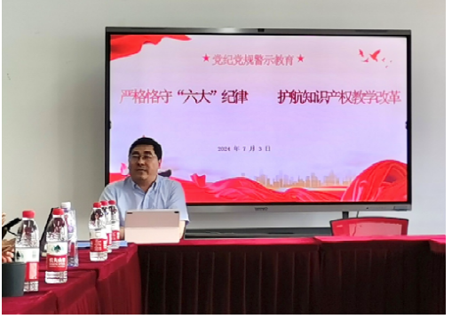 袁真富院长主讲《严格恪守六大纪律,护航知识产权教学改革》专题。他在党课中分享,贯彻落实党的二十大精神和习近平新时代中国特色社会主义思想,双方通过联建建立长效联络机制,努力以党建引领知识产权教学改革、提高复合型人才培养水平。袁真富院长强调,本院以中央政策为指引在知识产权教学改革方面实施系列活动,获得学生及用人单位的好评,要进一步提高“金专计划”的高质量发展服务创新经济发展。双方要以联合学习理论、联抓党员教育、联手服务群众、联心共同发展为主要内容,形成共建共发展的良好格局。