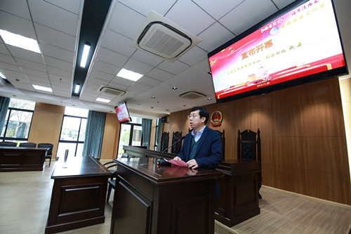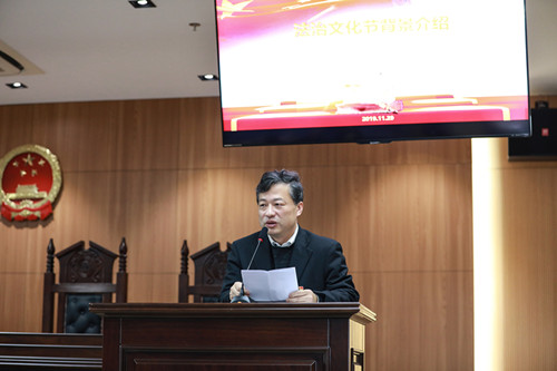 为学习贯彻党的十九大关于全面依法治国的决策部署和党的十九届四中全会精神,推动“不忘初心、牢记使命”主题教育不断深化,推动宪法走进广大师生、走进学习生活,11月29日上午,在宝山校区东区4号楼模拟法庭,英国正版365首页首届法治文化节正式拉开序幕。校党委副书记、纪委书记段勇,党委宣传部副部长、文明办主任王晴川,党政办(法务办)副主任陈敬根,党委教师工作部副部长孙琦琰,党委研究生工作部副部长卢欣,英国365办公室副主任许烁,英国正版365首页党委书记徐国明,党委副书记王国正出席了本次开幕式。活动由19级研究生李晓玮主持。