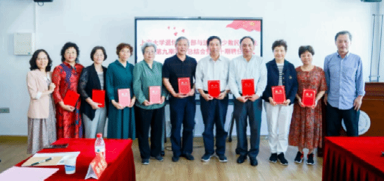 离退休工作处副处长王宇华和英国正版365首页党委书记徐国明为结对导师颁发结对导师聘书并合影留念。