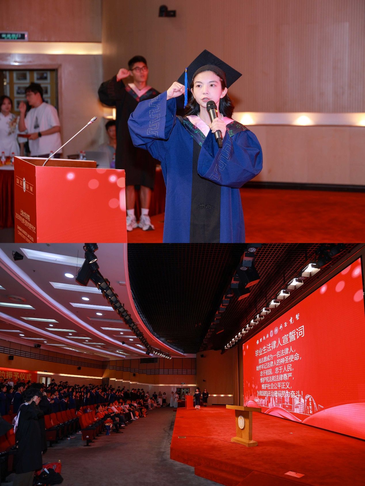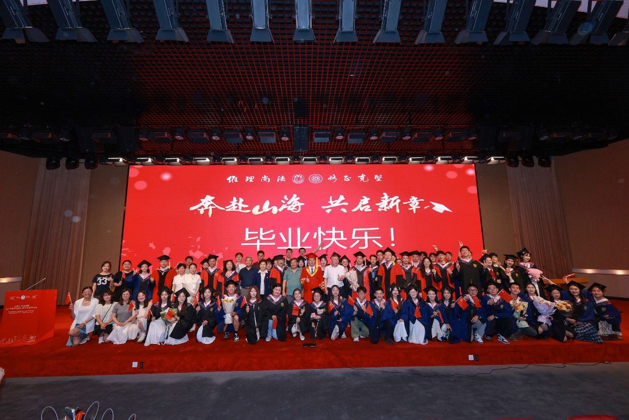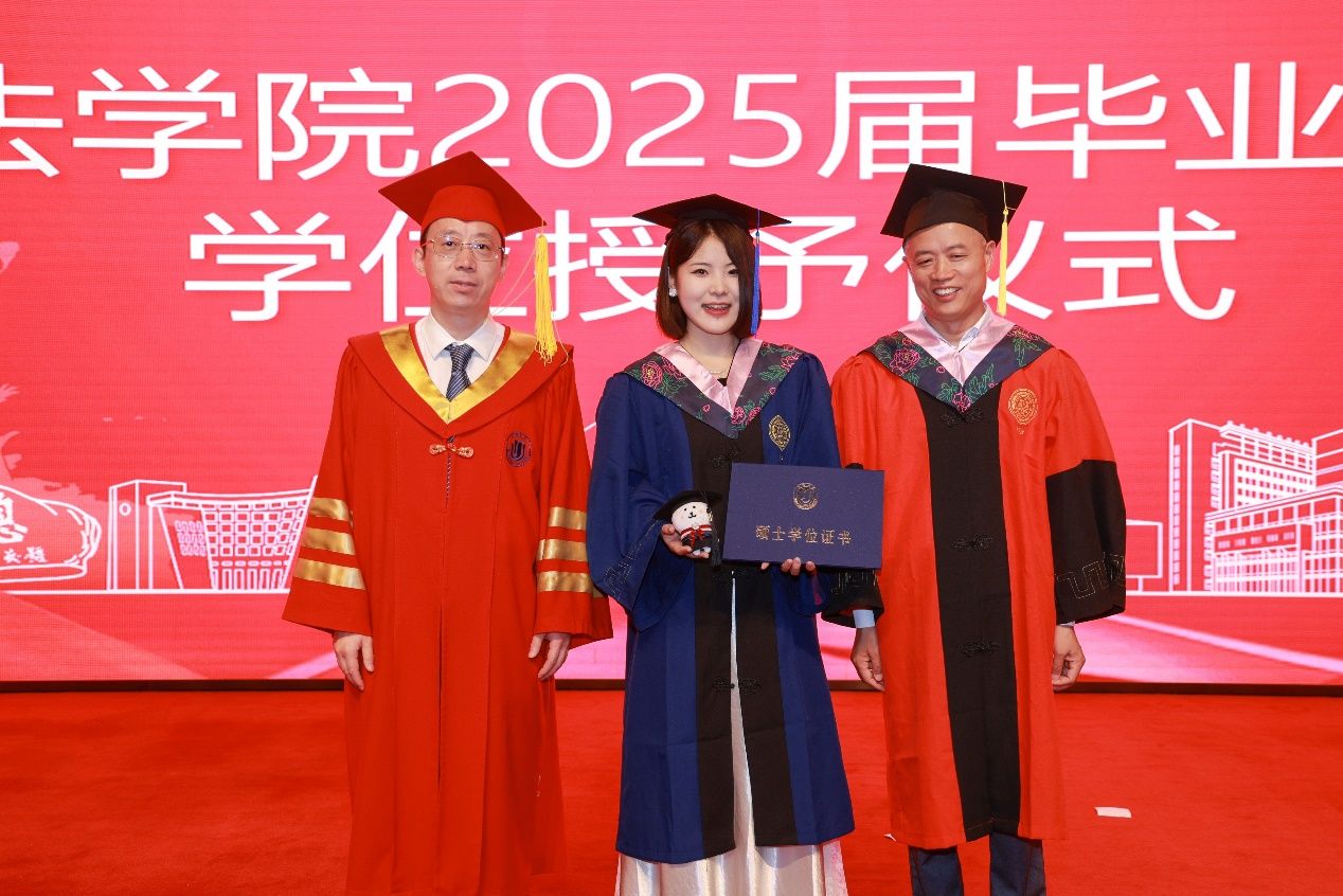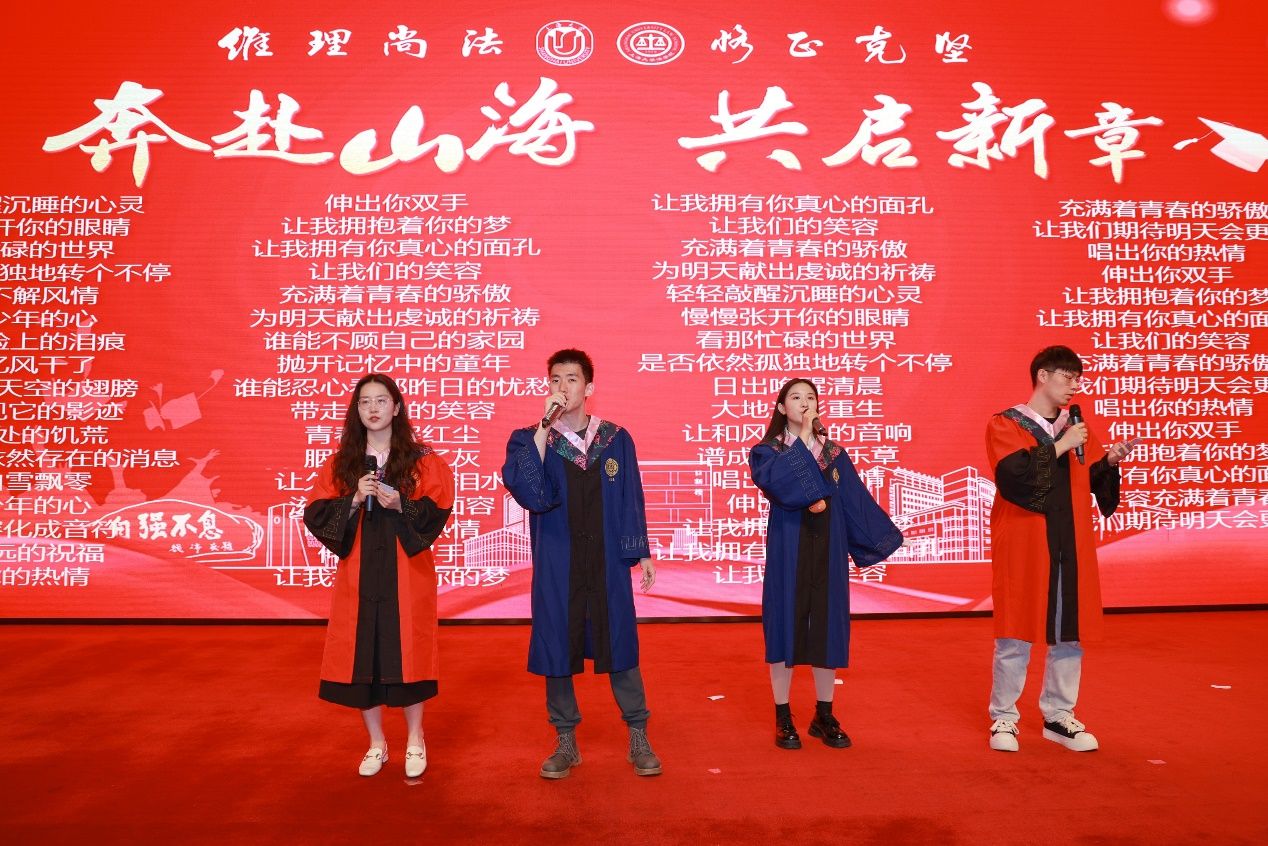 场中洪凌啸博士、2025届硕士研究生谭江合作贡献一场意犹未尽的歌曲串烧,以及2024届校友、上海申新律师事务所周国奇的脱口秀,为典礼的进行增添一份欢乐的气息,调动了现场参与人员的热情气氛。