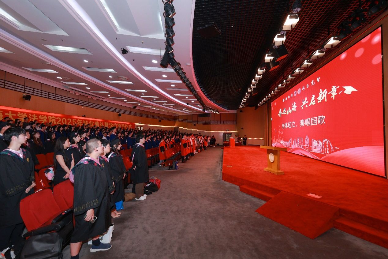 在毕业典礼开始前,承载师生满满回忆的2025年毕业生暖场视频唤起师生们的回忆。相伴着夏子轩、万旭阳、周传亮、罗晨辉、袁皞、万宇彤六位同学用美妙的歌声点燃了全场的氛围。在雄壮的国歌声中,毕业典礼正式拉开帷幕。