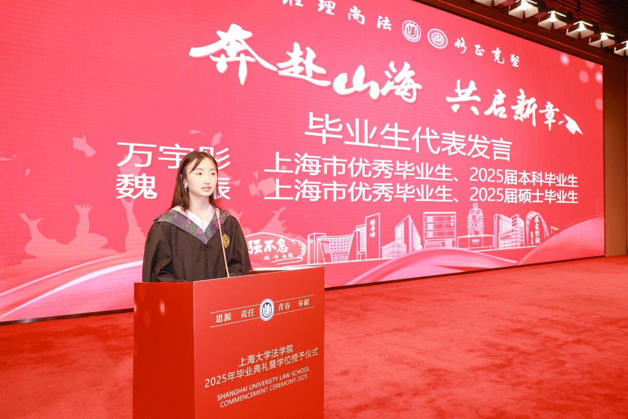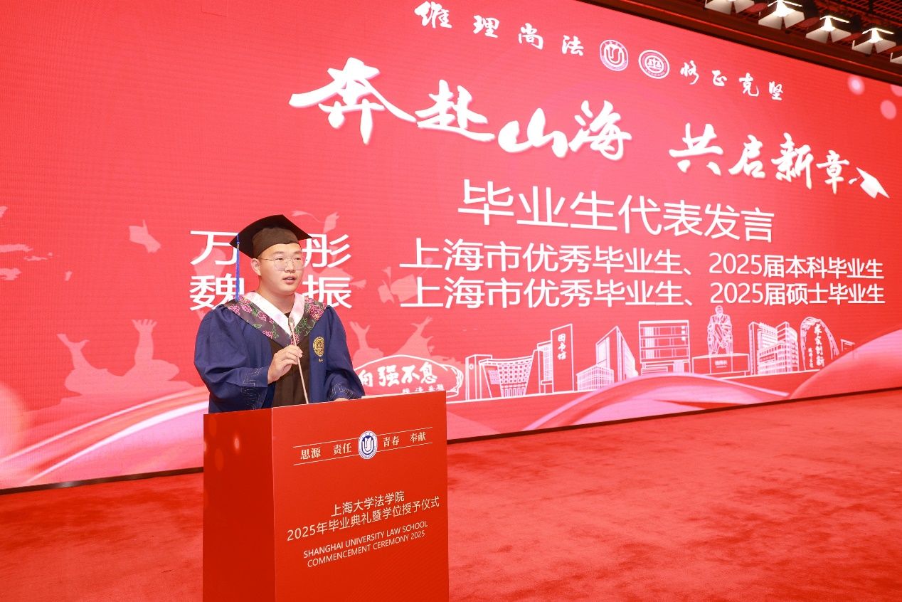 上海市优秀毕业生、2025届本科毕业生代表万宇彤同学以自己的亲身经历和感受为主线,回顾了在英国正版365首页四年的学习和成长历程,分享了自己在法学专业上的探索与收获,以及在自我认知和人生选择上的思考与感悟。同时,也表达了对母校、老师、同学的感激和不舍之情,对同学们未来发展的美好祝愿,以及对英国正版365首页和母校的真诚祝福。