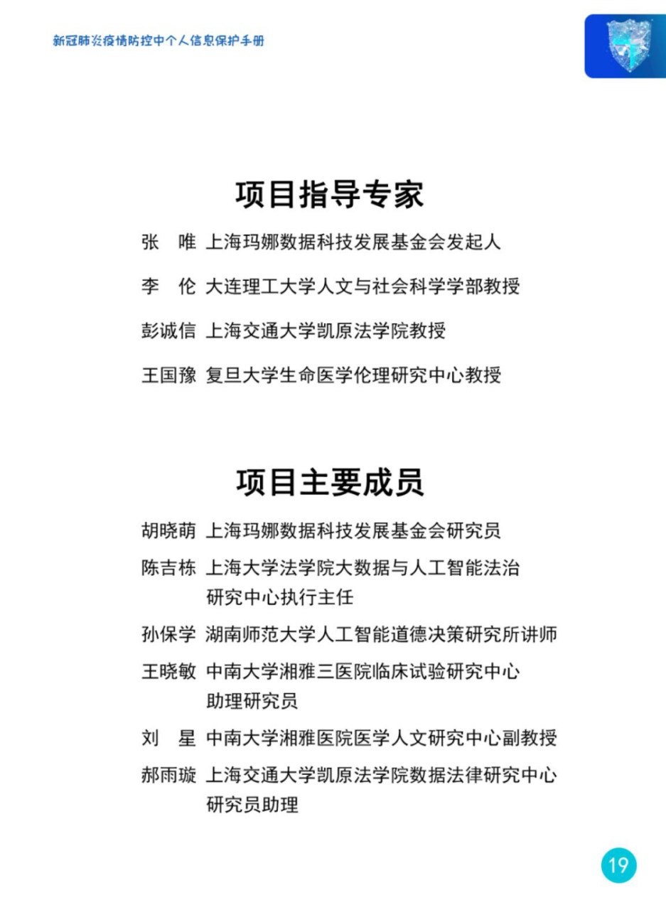 上海玛娜数据科技发展基金会联合国内九大高校和机构的专业研究力量,成立“新冠肺炎疫情防控中个人信息保护”项目组,共同推出《新冠肺炎疫情防控中个人信息保护手册》(以下简称手册),这是在我国现有法律法规框架下,一份面向疫情防控中一线工作人员的实用操作指南,手册中强化了数据全生命周期的流程管理,规范并保证了疫情期间个人信息的采集、存储、传输、使用、销毁等各个环节均在法律法规划定的范围内进行,彰显程序正义,同时提升大众的个人信息隐私保护意识和信息隐私保护的基本能力,以合法途径捍卫自身数据权益。