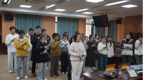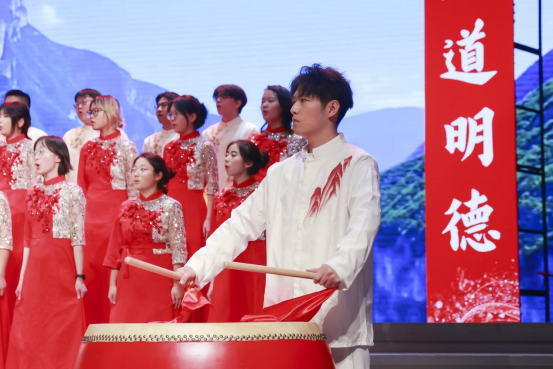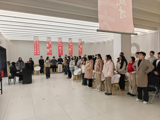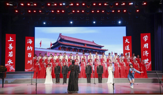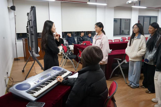 自比赛启动以来,学院高度重视,积极组织,由34名本科生、19名研究生、1名辅导员、7位退休老干部老教授组成的强大阵容以积极饱满的精神面貌投入到排练当中,音乐学院肖盈盈同学担任指挥、李一诺同学担任钢琴伴奏。