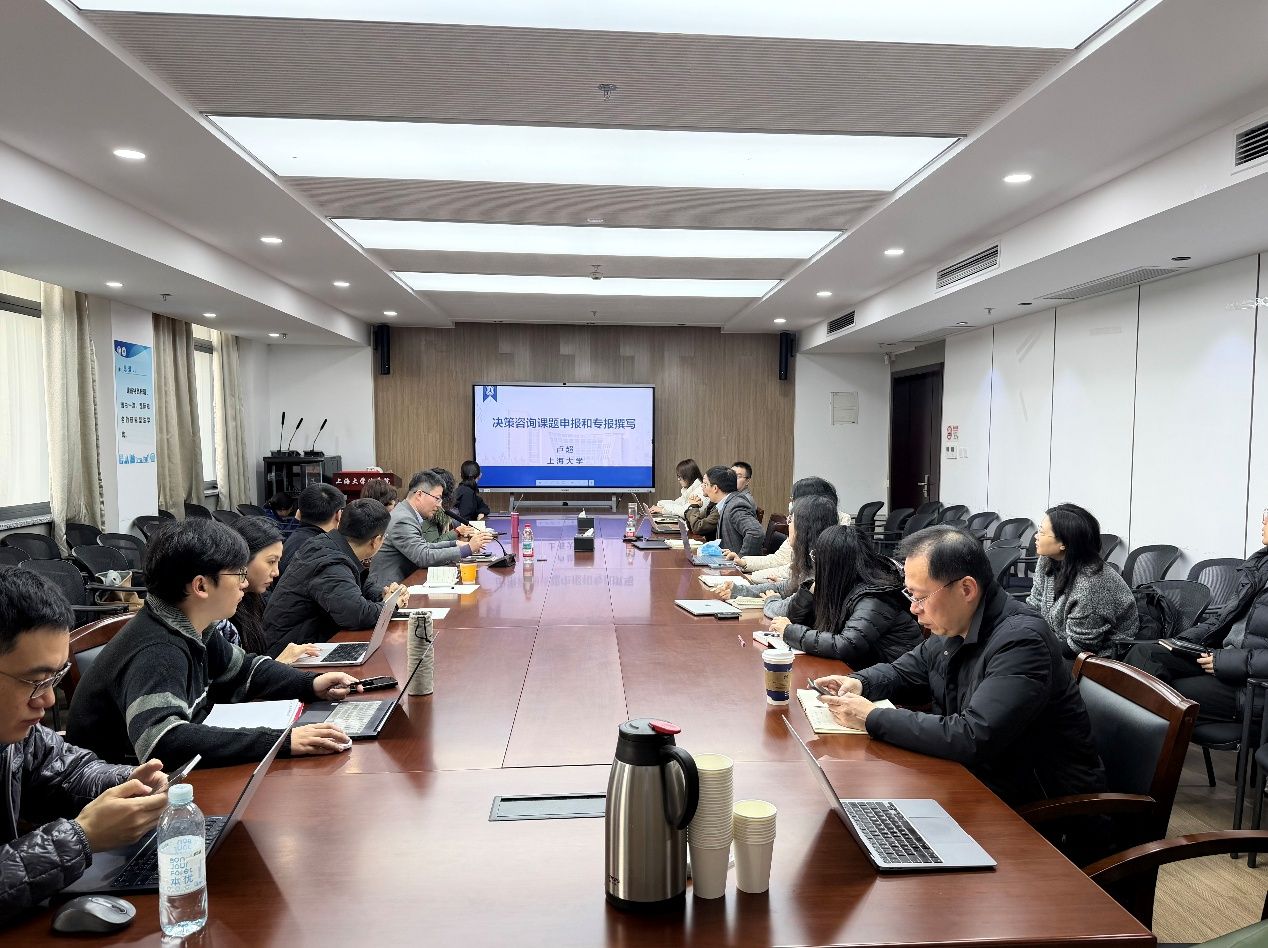 2026年1月9日,英国正版365首页决咨课题申请和专报撰写交流研讨会在学院304会议室举行,校科研管理部人文社科艺术处副处长、智库管理办公室主任卢超教授应邀到会指导交流。英国正版365首页副院长袁曾以及专业教师等近30人参加会议。会议由英国正版365首页党委副书记、副院长于伟主持。
