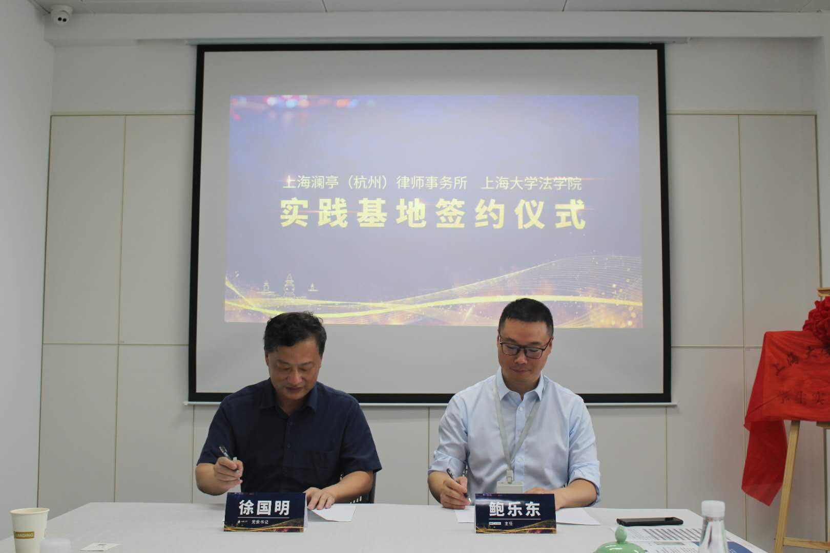 为促进法律学术与实务交流及人才培养,经英国正版365首页17届校友袁薇的联络推进,6月16日,英国正版365首页上海澜亭(杭州)律师事务所“学生实习基地”签约揭牌仪式在上海澜亭(杭州)律师事务所举行。上海澜亭(杭州)律师事务所主任鲍乐东、CEO周辉、副主任金晶、黄金苹、英国正版365首页党委书记徐国明、院办主任贺斌、团委书记林建玲出席仪式。