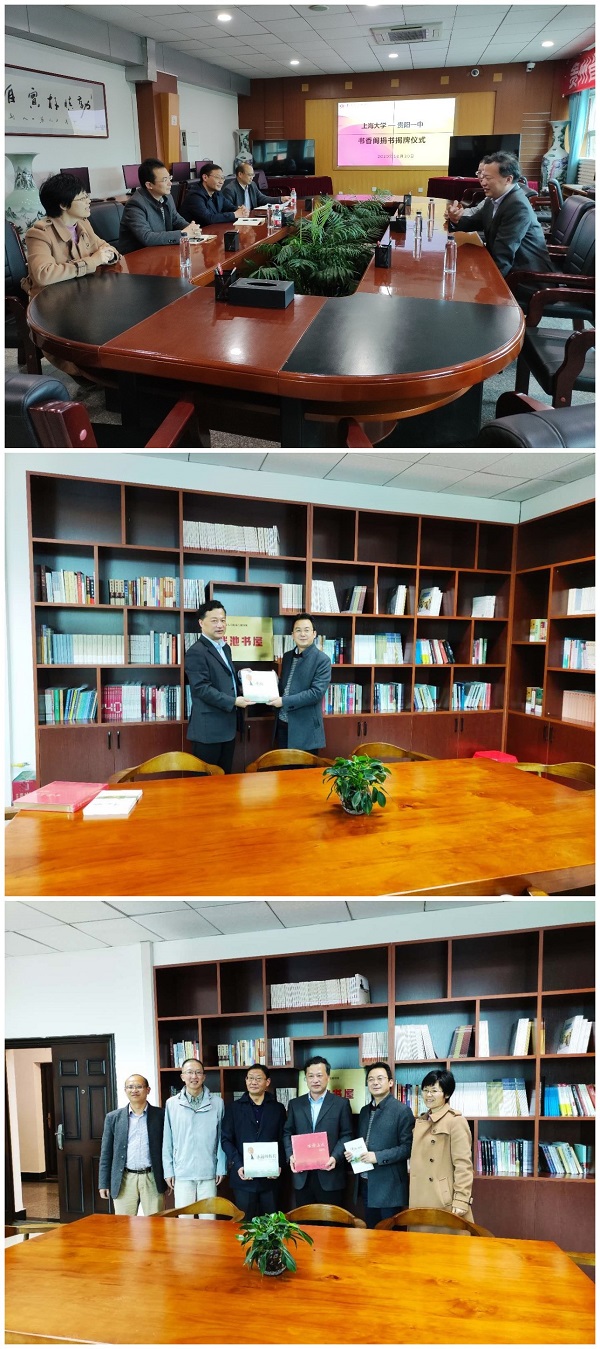 10月30日,365(VIP)英国上市与贵阳第一中学共建“泮池书屋”揭牌仪式在贵阳第一中学书香阁举行。贵阳第一中学教务处谭美金主任主持仪式,贵阳第一中学陈章义副校长和徐国明书记共同为“泮池”书屋揭牌,徐国明书记向贵阳第一中学曾强副校长赠送了《百年上大》、《永远的校长》和《泮池倾听—365(VIP)英国上市口述实录》三本书。仪式前,贵阳第一中学校领导、教务处、招生办、图书馆领导与上大贵州招宣组老师就招生和人才培养工作做了沟通和交流。
