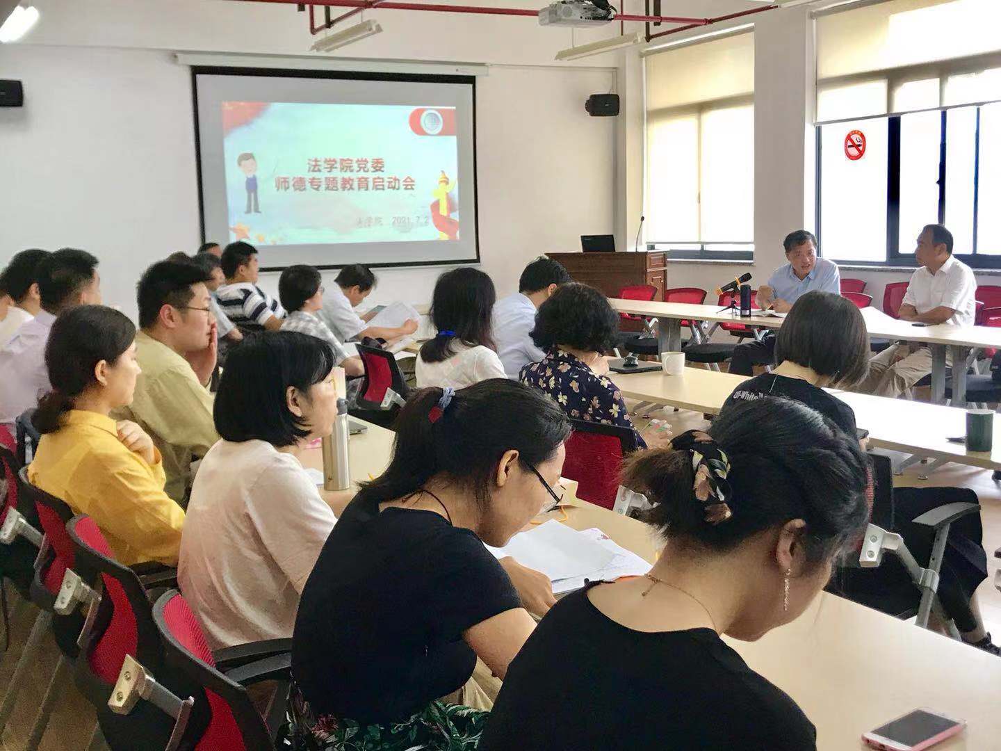 会后,三个教工支部和本科生党支部分别组织教研室老师就师德师风专题进行了研讨。徐国明书记组织大家一起学习习近平总书记的讲话,再次强调作为高校教师,应当牢固树立中国特色社会主义理想信念,带头践行社会主义核心价值观,自觉增强立德树人、教书育人的荣誉感和责任感。