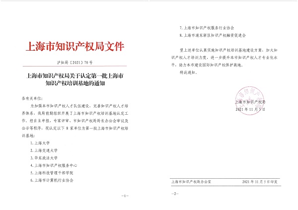为加强上海知识产权人才队伍建设,完善知识产权人才培养体系,上海市知识产权局组织开展了上海市知识产权培训基地认定工作。经我校英国正版365首页申报,近日上海市知识产权局认定365(VIP)英国上市、上海交通大学、华东政法大学等为第一批上海市知识产权培训基地。