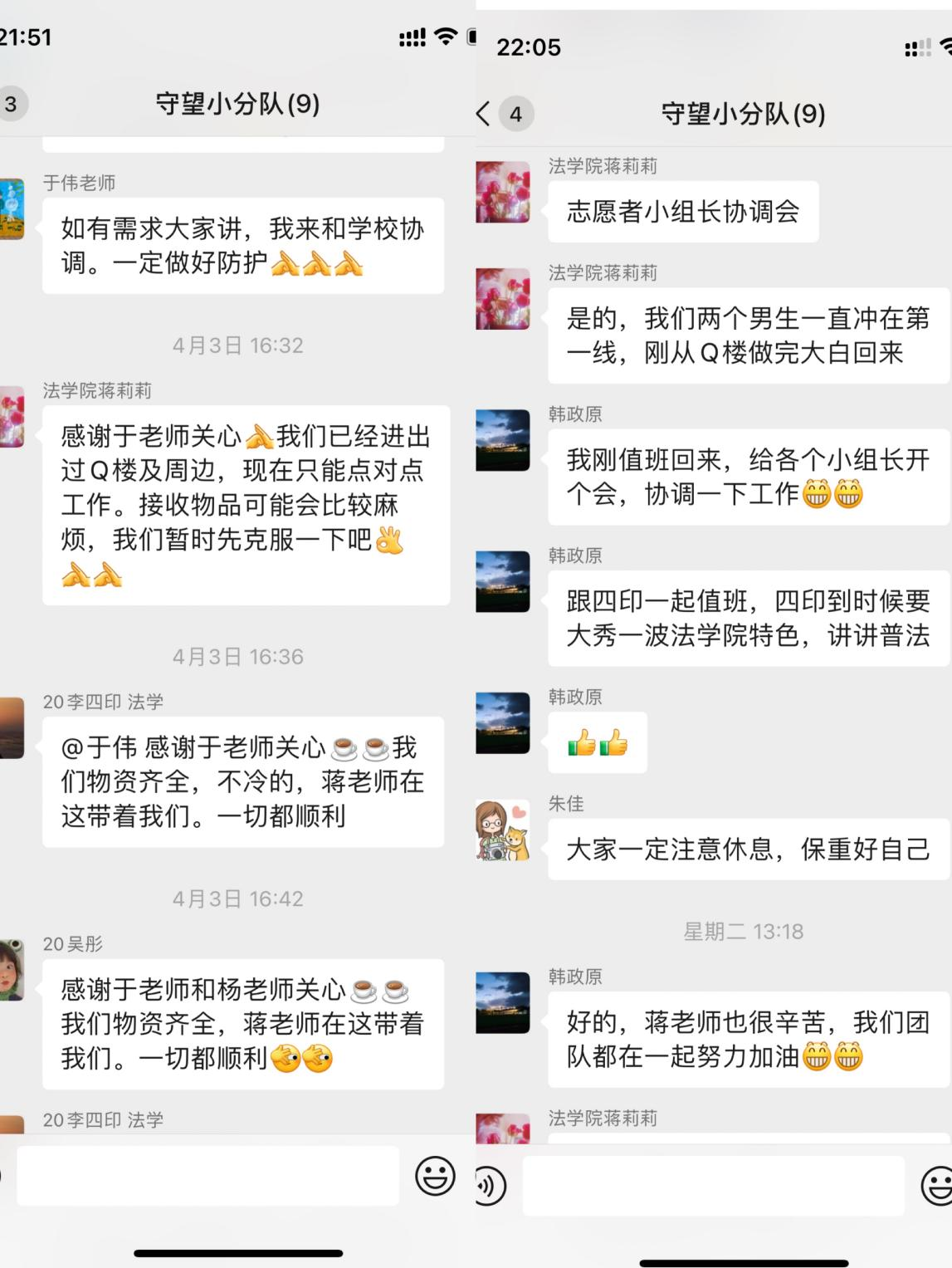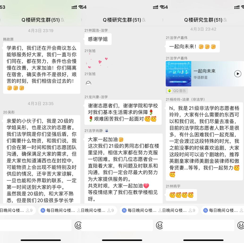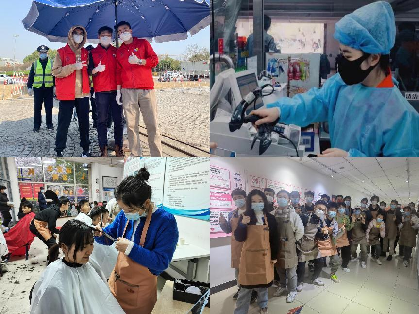 除这几位志愿者以外,乐乎楼、超市收银处、秩序维护处、物资维护处、理发处等到处都能看到学院志愿者同志的身影。他们或许是在南门站一班岗,或者是参与一次核酸检测,在下课后去教超帮忙,又或者是加入“tony天团”为师生理发......疫情面前,他们逆行而上,奋勇担当。