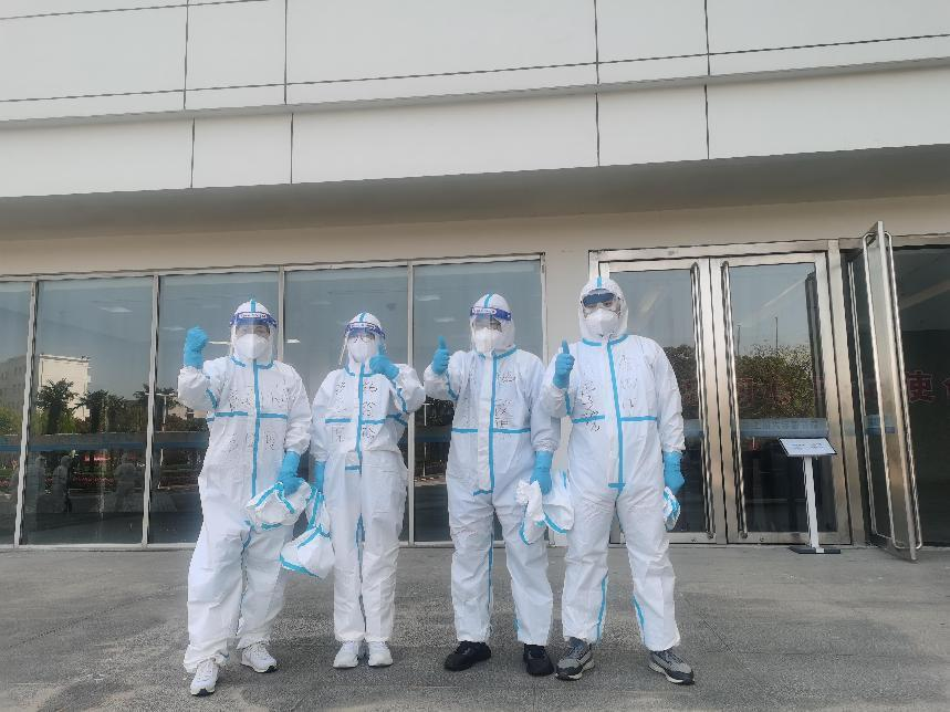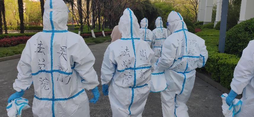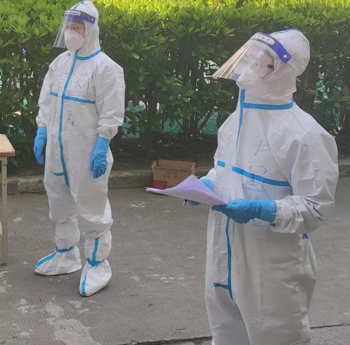得知同年级男生均在Q楼封闭管理,研究生一年级的两位女支部书记肖静、杨玲玲表示:“只要有需要,我们随时出发。”在本次志愿活动中,她们穿上防护服与志愿队其他老师和同学们,将每日的餐饮、抗原试剂盒,分发到同学们的手中。战“疫”过程中,她们冲锋在前,彰显着“巾帼不让须眉”的精神。