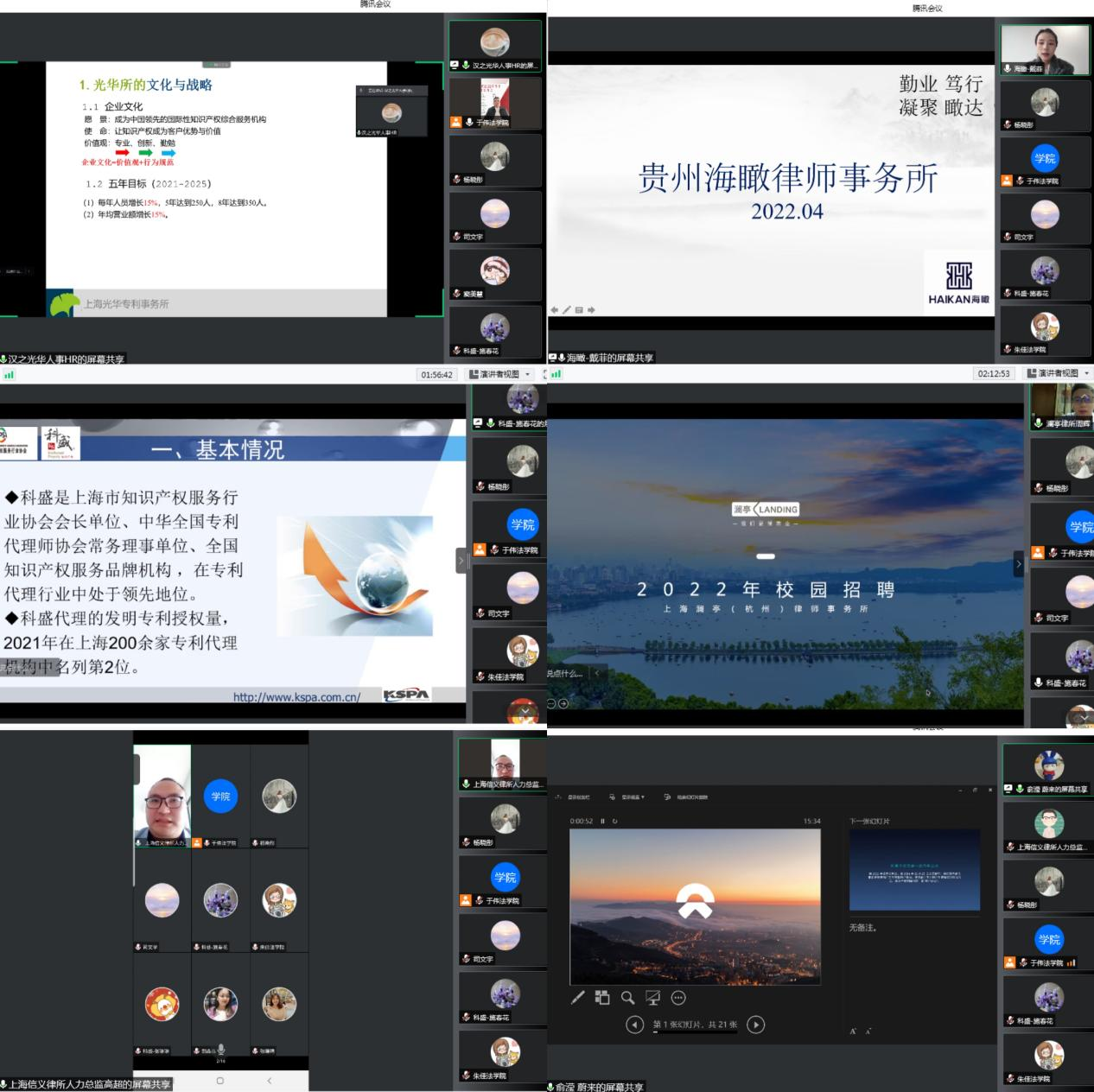 上海光华专利事务所、贵州海瞰律师事务所、上海科盛知识产权代理有限公司、上海澜亭(杭州)律师事务所、上海市信义律师事务所、上海蔚来汽车有限公司等优质单位提供了包括商标代理人助理、知识产权管理销售、专利事务律师、数据合规法律顾问、实习律师、律师助理等31个工作岗位。招聘宣讲人员主要从单位365、招聘岗位、人才培养计划、福利补贴等方面进行宣讲介绍。通过对核心业务板块、竞争优势、岗位特性、业务特点、人才培养机制、办公环境等方面的介绍,同学们初步了解到公司365与企业文化。各用人单位都特别介绍了本单位的人才培养计划,还就毕业生关心的薪资福利等问题进行了讲解。