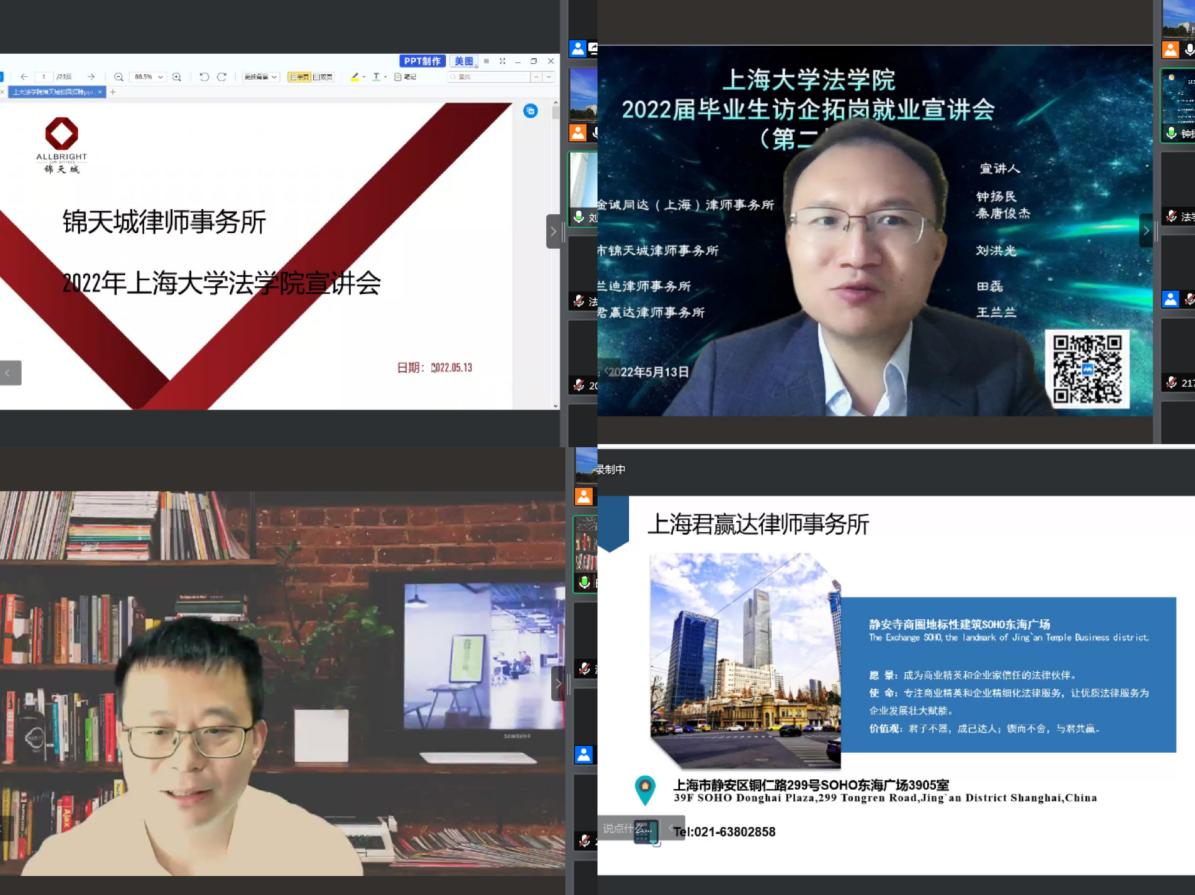 本次线上招聘会共有北京金诚同达(上海)律师事务所、上海市锦天城律师事务所、上海兰迪律师事务所、上海君赢达律师事务所四家优质律所参与,四家律所针对英国正版365首页的专业特色和学生就业需求,提供了专业对口的律师助理、实习生等若干工作岗位。各律所宣讲人向同学们介绍了律所的业务范围、工作环境、职业发展及招聘岗位的具体要求。多名律师校友在结合自身职业经历的基础上,分别从求职学生角度和律师事务所角度,对投递实习简历、进入律所实习、成为青年律师的三个不同阶段所需注意的要点进行提示,鼓励同学们在进行职业规划时放平心态,主动争取磨砺和提高个人能力的机会;并在工作中认真务实关注细节,培养自身对于律师职业工作强度的耐受力。在宣讲会的自由交流环节,同学们围绕薪资待遇、转正要求、职业发展前景等问题与宣讲人积极互动,各用人单位就同学们关心的问题进行了耐心、详细的解答。