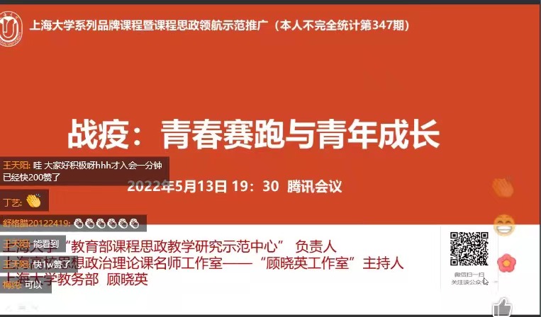 在“战疫—青春赛跑与青年成长”主题讲座中,顾晓英教授从自己小区战疫故事娓娓道来,并结合自身的经历解读“战疫”。她提到如今我们正面临百年变局、疫情之下大学生的校园生活、高校中的思政所面临的难度和挑战。同时,结合其自身数十年的教学丰富经验,提出教师与学生角色面临时代转型、新时代教师和学生都应该有高站位、宽视野。最后她寄语同学们“向内求”,疫情期间享受阅读,学会情绪管理,学会整理收拾,要有时间观念,每天睡前复盘进行反思,坚持运动,加强自律,学会“看见”,承担起青年自身责任,积极参加疫情下的志愿服务等,希望同学们跑出疫情下青春赛道最好的成绩。顾老师精彩的讲座获得了英国正版365首页师生热烈的回应。