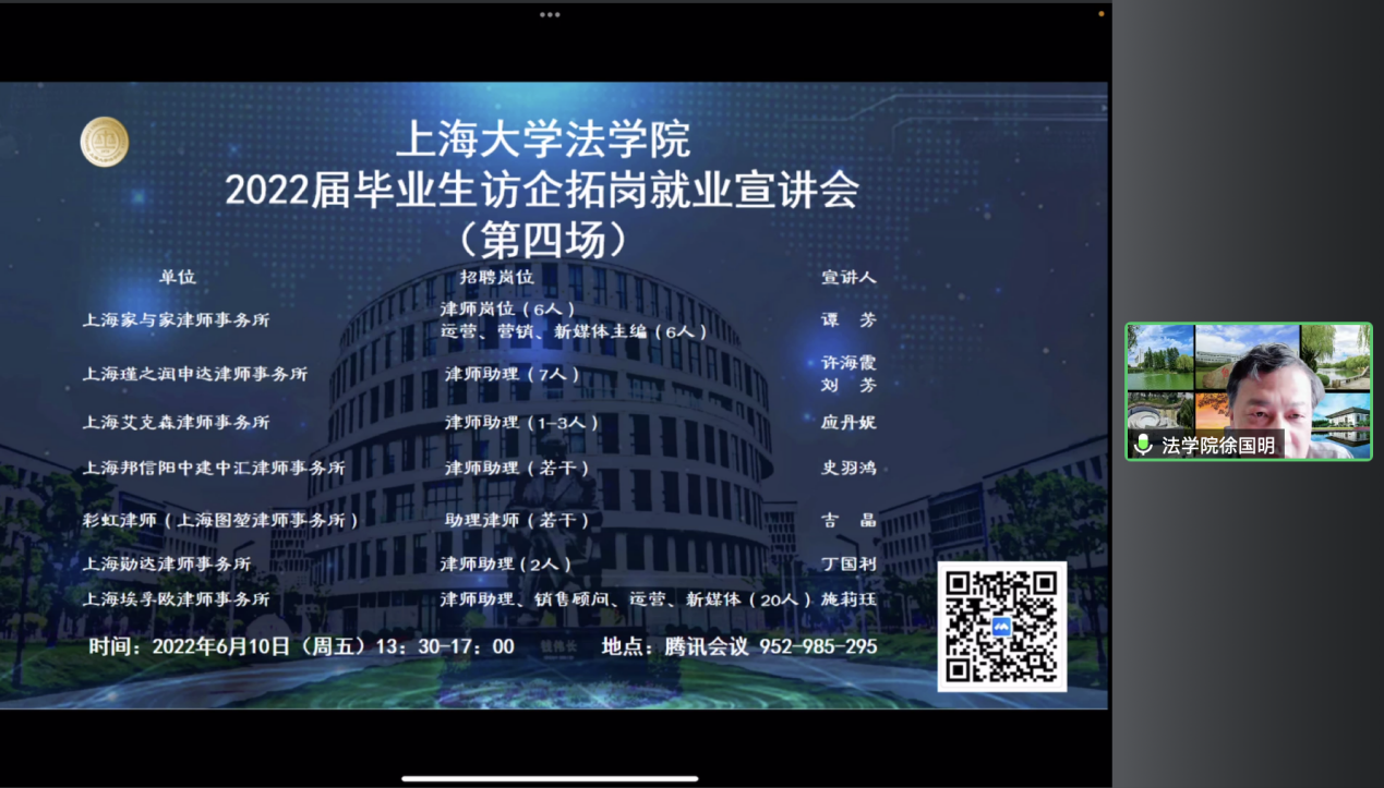 6月10日下午,英国正版365首页访企拓岗促就业宣讲会(第四场)顺利举行。上海家与家律师事务所主任谭芳、上海瑾之润申达律师事务所主任许海霞、副主任刘芳、上海艾克森律师事务所人力专员应丹妮、上海邦信阳中建中汇律师事务所合伙人史羽鸿、彩虹律师(上海图堃律师事务所)法务总监吉晶、上海勋达律师事务所主任丁国利、上海埃孚欧律师事务所管理合伙人罗兴,365(VIP)英国上市招生与毕业生就业工作办公室副主任贺利,英国正版365首页党委书记徐国明以及英国正版365首页2022届毕业生同学和其他年级学生近百人出席交流会。交流会由英国正版365首页党委副书记、副院长于伟主持。
