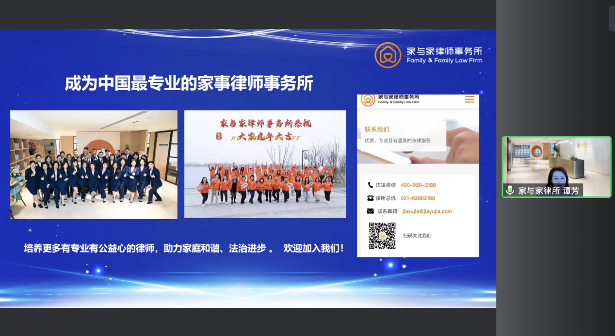 上海家与家律师事务所主任、第四届“东方大律师”谭芳律师介绍了上海家与家律师事务所的发展历程和取得的成绩。该所是一家专注于婚姻家事和财富管理的优秀团队,聚焦婚姻家事,创新法律服务,其创所宗旨是“幸福小家,成就大家”,其愿景是成为中国最专业的家事律师事务所。同时,谭芳主任还对律所的招聘的岗位和相关的要求进行了介绍。