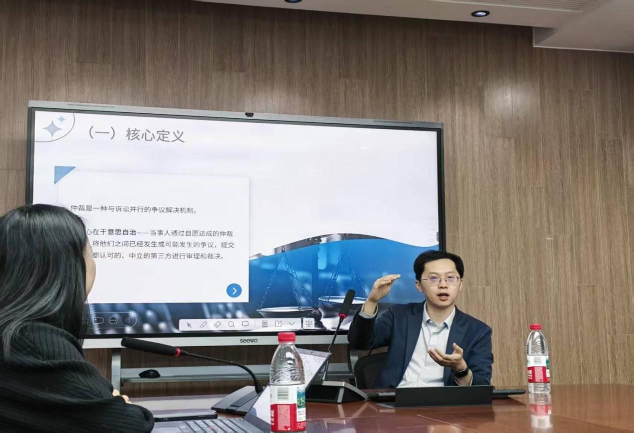讲座开篇,陶俊律师即对仲裁制度作出了基础介绍,用生动的案例将仲裁条款与诉讼进行对比,阐释仲裁的保密、高效、专业、国际执行力等核心优势。其次,探讨了自1982以来仲裁机构从萌芽到如今进入国家总体战略的新定位的发展历程,最后提及了仲裁与调节的衔接机制以及目前仲裁存在的缺陷,并进一步展望仲裁未来的发展方向。
