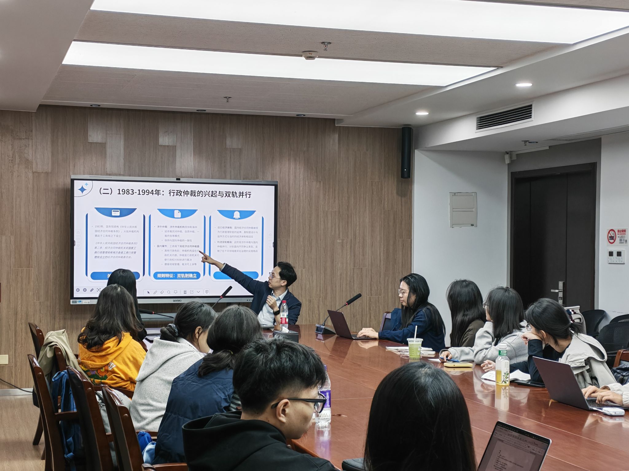 随后,在提及程序令与证据披露时,两位律师介绍了仲裁在实操中的环节,加深同学对仲裁操作的理解。此外,黄岚律师简要说明了近年来临时仲裁在我国的发展,并指出当今中国不同于西方临时仲裁的机构仲裁为主流,将仲裁置于国际背景下,展现仲裁业务的国际性,揭开仲裁的神秘面纱。