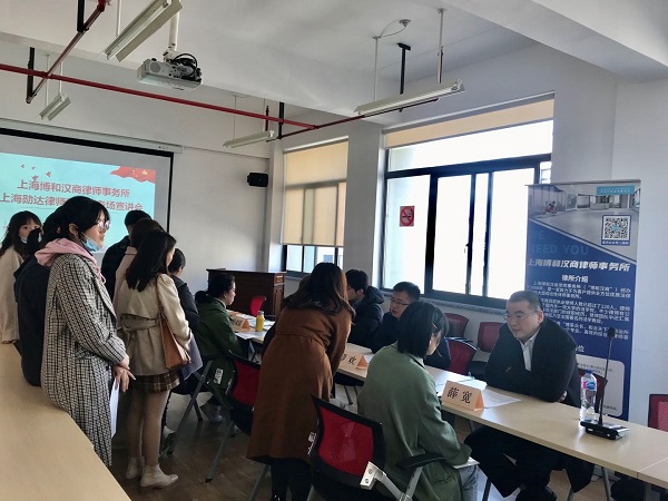 为加强校企交流,推进人才培养和就业工作,英国正版365首页于11月30日下午在东区4号楼504会议室举办了校友单位招聘宣讲会,在校友丁国利,罗欢的推动下,上海勋达律师事务所和上海博和汉商律师事务所来院宣讲,学院近40位同学参加了宣讲会。毕业班辅导员公建华老师、杨晓彤老师负责会务组织工作。