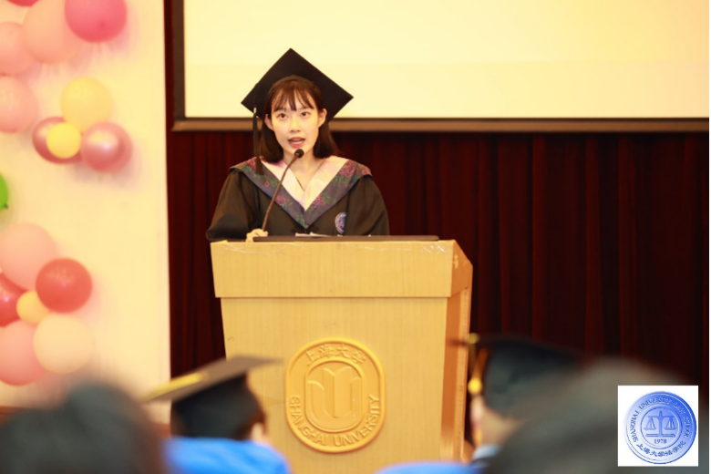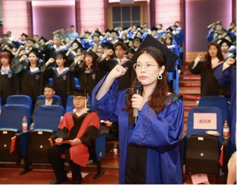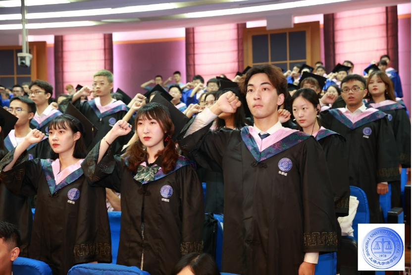 上海市优秀毕业生、英国正版365首页2021届硕士研究生樊子琪带领全体毕业生进行法律人宣誓。