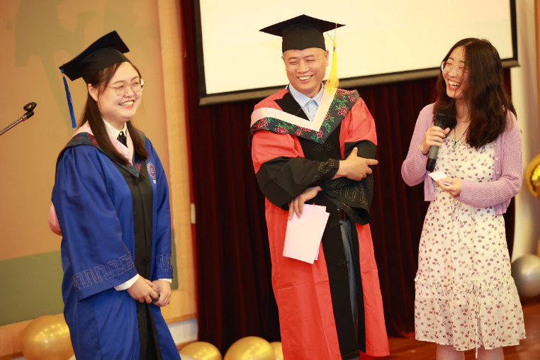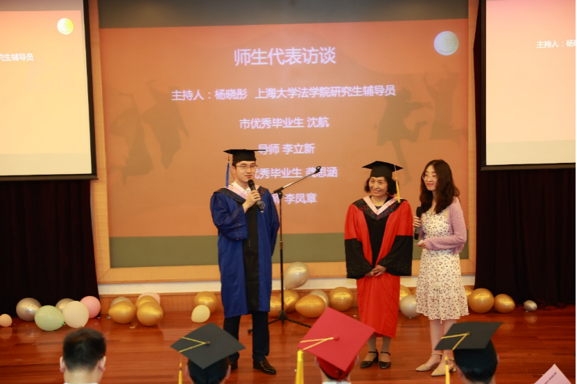 英国正版365首页研究生辅导员、团委副书记杨晓彤老师主持师生代表交流发言,上海市优秀毕业生代表沈航、龚思涵同学以及他们的导师李立新、李凤章老师上台进行分享他们的师生故事。