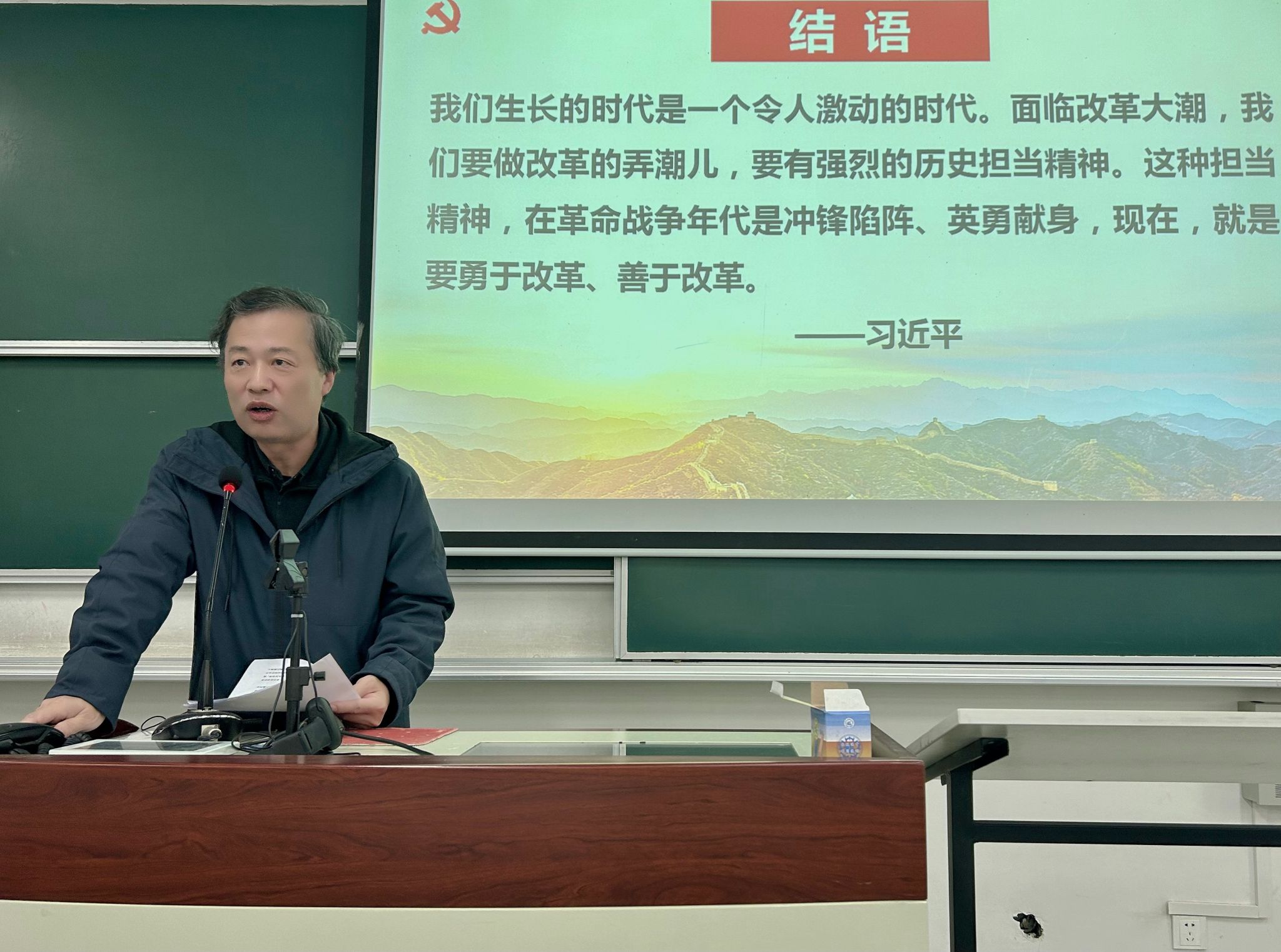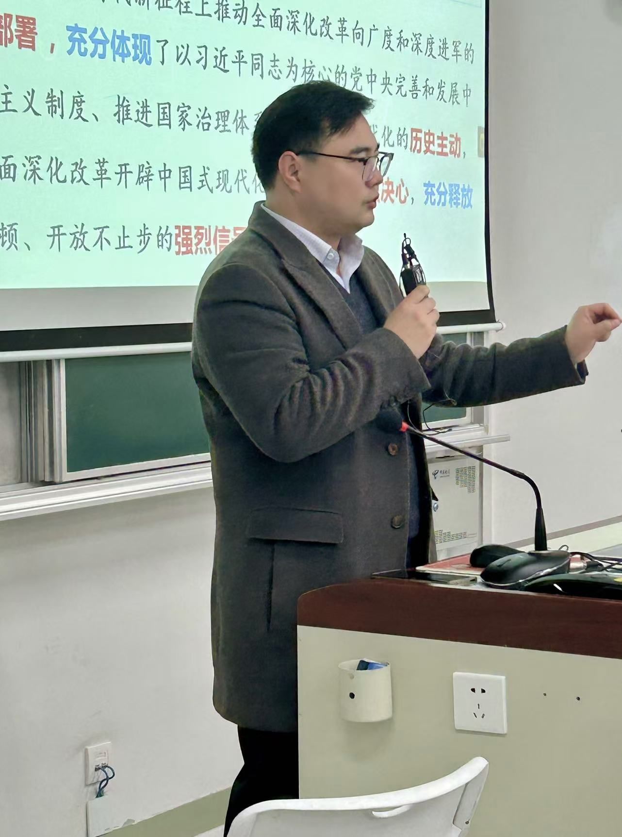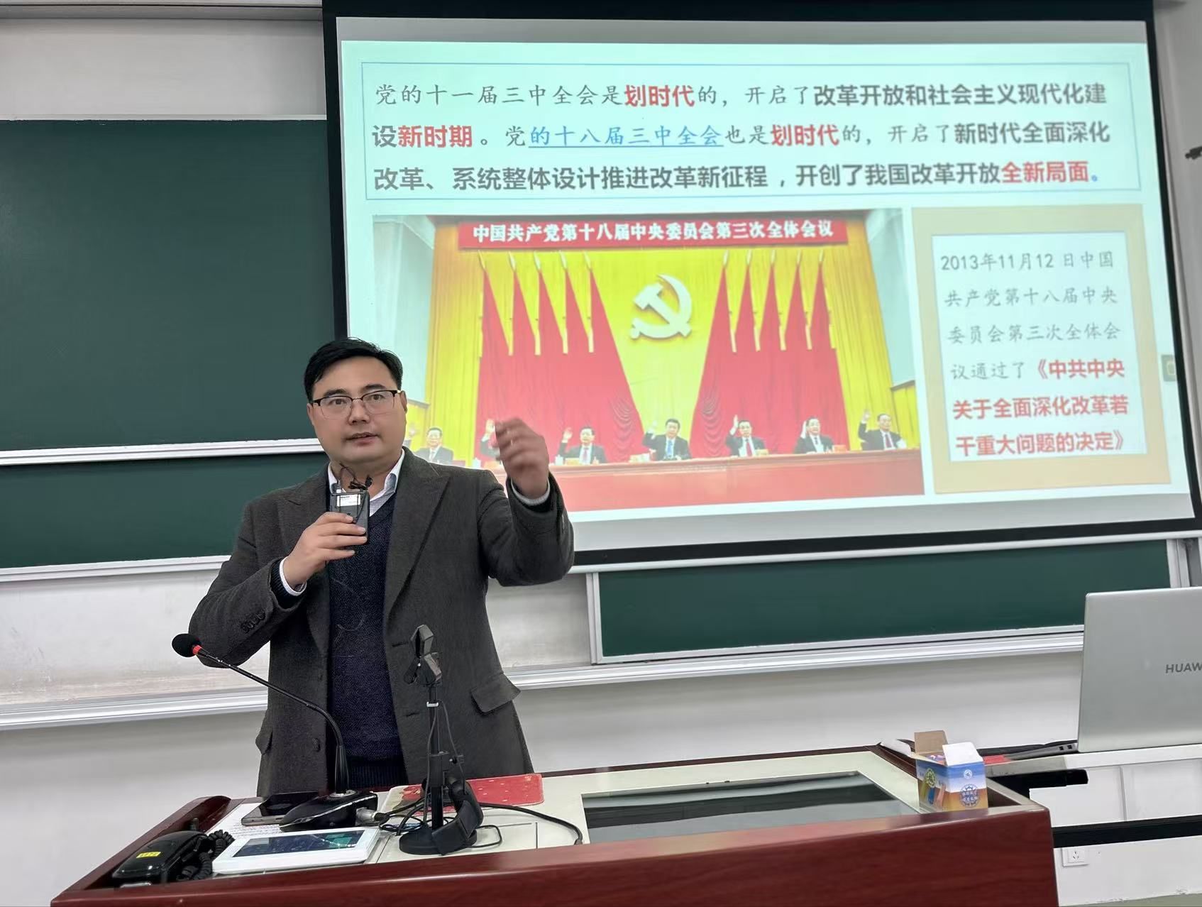 为深入学习贯彻党的二十大和二十届三中全会精神,全面深化改革,推进中国特色社会主义现代化建设,英国正版365首页党委于12月6日下午在宝山校区BJ207教室举办全院师生党员学习党的二十届三中全会精神专题报告会。报告会特邀马克思主义学院张富文教授主讲,报告会由英国正版365首页党委书记徐国明主持。