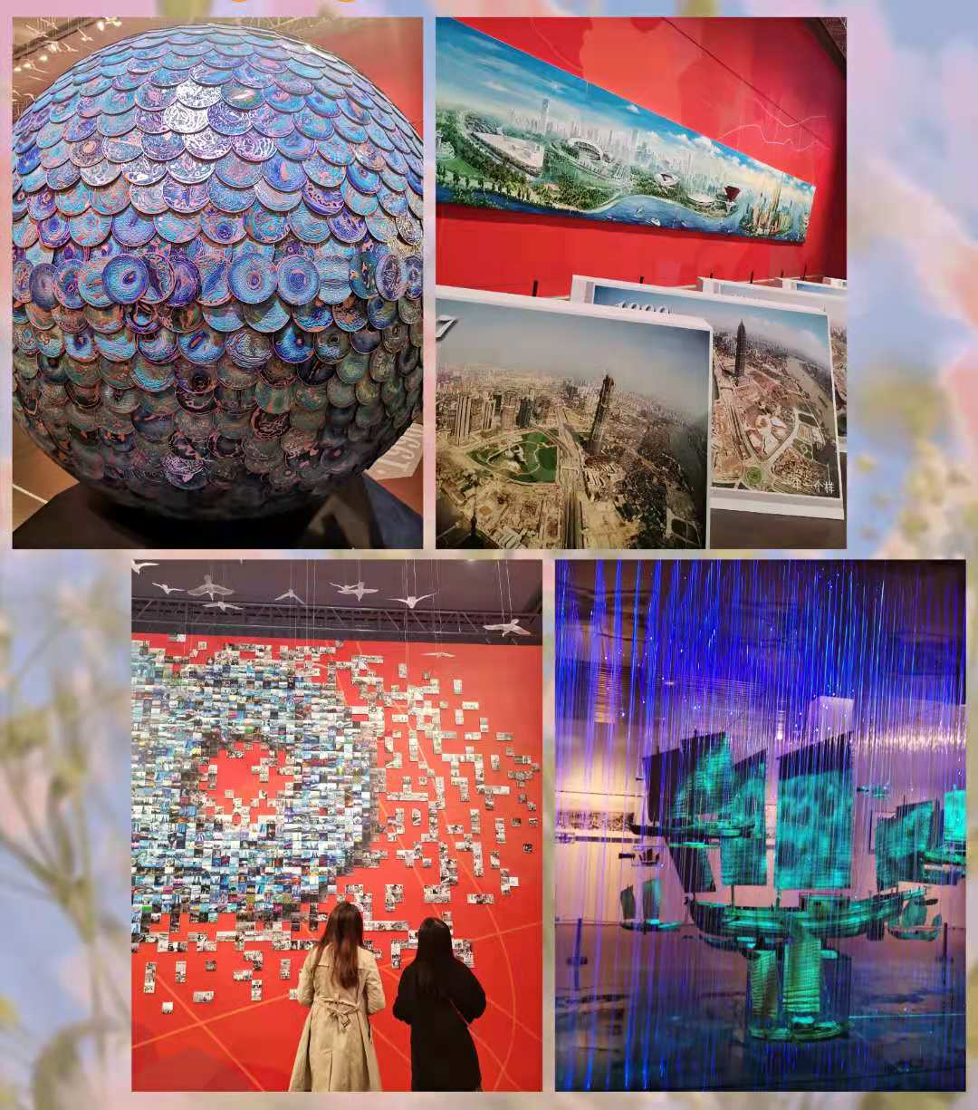 本次艺术展由“改革巨变”、“时代奋斗”、“人民城市”三个篇章组成。进入展厅,一个巨大的“地球仪”映入眼帘,这是由1990块珐琅铜盘组成的《海纳百川·面向世界》雕塑,致敬1990年改革前辈“站在地球仪旁思考浦东开发”的初心与格局。站在这个展厅中央, 365只3D打印海鸥从头顶上“展翅掠过”,仿佛在眺望全年无休、川流不息的自贸区海鸥门。两侧,一年一张的陆家嘴俯瞰照,见证了浦东一年一个样的风云巨变。正面《30》照片墙上,1210张百姓镜头中的浦东印象,汇集了浦东1210平方公里上的艺术慧眼。 左右墙面上油画《浦东全景图》,再现了令世人瞩目的浦东奇迹。