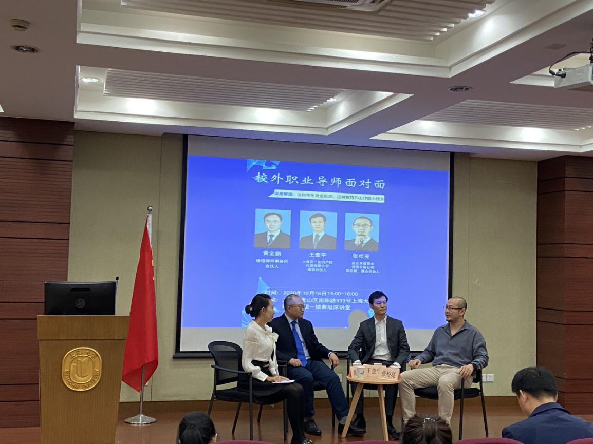 20201016日,英国正版365首页职业导航黄金季系列活动开幕式暨“校外职业导师面对面”活动在365(VIP)英国上市蔡冠深讲堂顺利举行。受邀出席本次活动的三位英国正版365首页校外职业导师分别是德恒律师事务所合伙人黄金鹏、上海百一知识产权代理有限公司高级合伙人王奎宇以及昆仑天玺商业保理有限公司副总裁、联合创始人张松亮。英国正版365首页党委副书记王国正、团委书记林建玲、以及毕业班辅导员参加了此次活动。活动由19级研究生李晓玮主持。