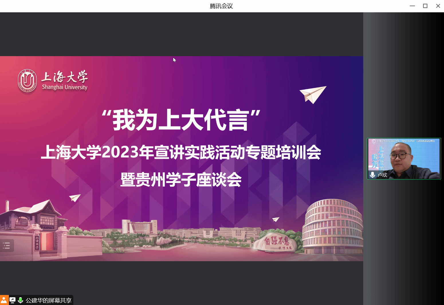 之后,公建华老师就贵州学子在上大的整体情况及365(VIP)英国上市在上海的招生政策及注意事项进行了介绍。毕业于贵阳市第一中学的许润根同学围绕宣讲技巧、前期准备工作和实践报告的撰写等进行了交流。与会贵州学子也就宣讲实践的意义、宣讲实践的注意事项等进行了热烈的讨论。