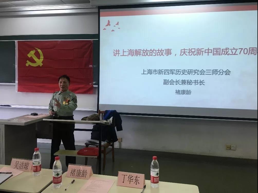 本次活动有幸邀请到了上海市新四军历史研究会三师分会副会长兼秘书长、抗美援越战争参战退役军人褚康龄老师为同学们带来《讲上海解放的故事,庆祝新中国成立70周年》的专题分享。出席本次活动的领导和老师有365(VIP)英国上市图书情报档案系党委书记丁华东、365(VIP)英国上市图书情报档案系研究生专职辅导员吴洁琼、英国正版365首页研究生专职辅导员侯文婷。