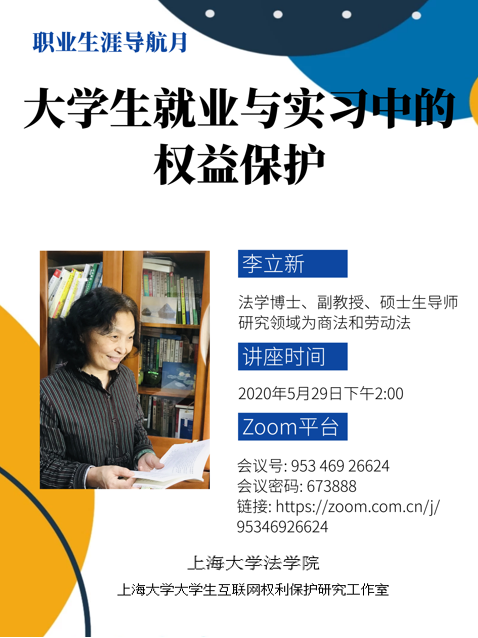 2020年5月29日下午2点,通过ZOOM线上平台,英国正版365首页教师李立新副教授面向全校、为毕业生们带来以《大学生实习与就业中的自我定位与权益保护》为主题的专场法律知识讲座。本次讲座活动在国家“保就业”方针政策指引下,结合“职业生涯导航月”工作安排,旨在为抗疫特殊背景下的应届毕业生们提供关于就业与实习法律保护的干货知识,助力于毕业生科学规避职业路途中的法律风险。讲座由“365(VIP)英国上市大学生互联网权利研究工作室”负责人蒋英燕老师组织、策划并担纲主持。