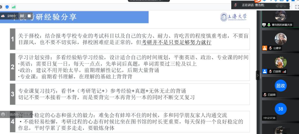 2022年5月19日晚上,英国正版365首页2022年考研经验朋辈分享交流会通过腾讯会议顺利举行。本次会议由英国正版365首页2018级本科生曹浩然、姬雪薇、彭建和黄振国做经验分享。英国正版365首页本科生辅导员公建华老师和30余位本科生在线参加。分享会由英国正版365首页2018级本科生白居政主持。