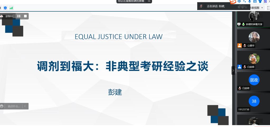 彭建同学从怎么看待考研、法考与考研的关系以及如何检验背书效果三个方面进行了分享。他将自己对考研的深刻认识娓娓道来,指出考研过程中目标越远大则会对自己越怀疑,并提出努力和进步是克服自我怀疑的根本方法。随后,他告诉同学们可以勇敢尝试,抓住法考和考研的机会。最后他详细介绍了三轮记忆以及检验背诵效果的具体标准。彭建同学的分享深入浅出,从对深刻的灵魂体验出发,落脚到具体可行的方法和标准上,同学们深表受益匪浅。