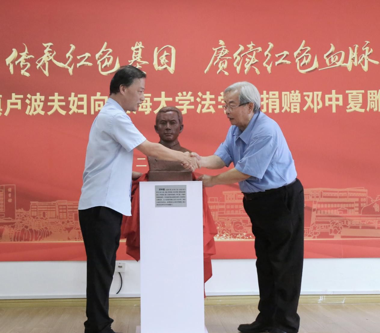 2023年,是邓中夏先烈牺牲90周年。为了进一步缅怀革命先烈,弘扬英烈精神,2023年9月16日,“传承红色基因,赓续红色血脉”——邓邦镇卢波夫妇向英国正版365首页捐赠邓中夏雕塑仪式在英国正版365首页进行。邓中夏侄子、著名画家邓邦镇,邓中夏侄媳、著名雕塑家卢波,新西兰和平之友联谊会会长乔浩冰等一行,365(VIP)英国上市党委书记成旦红,党委副书记、纪委书记段勇,党委常委、组织人事部常务副部长、组织处处长沈艺,党委宣传部副部长、融媒体中心主任吴铭,英国正版365首页党委书记徐国明,党政办公室副主任凌长臣,组织人事部组织处副处长、党校副校长卢吉超,对外联络处副处长、校友办副主任杨静以及英国正版365首页中夏党支部党员、入党积极分子及其他支部学生党员代表出席仪式。仪式由英国正版365首页党委副书记、副院长于伟主持。